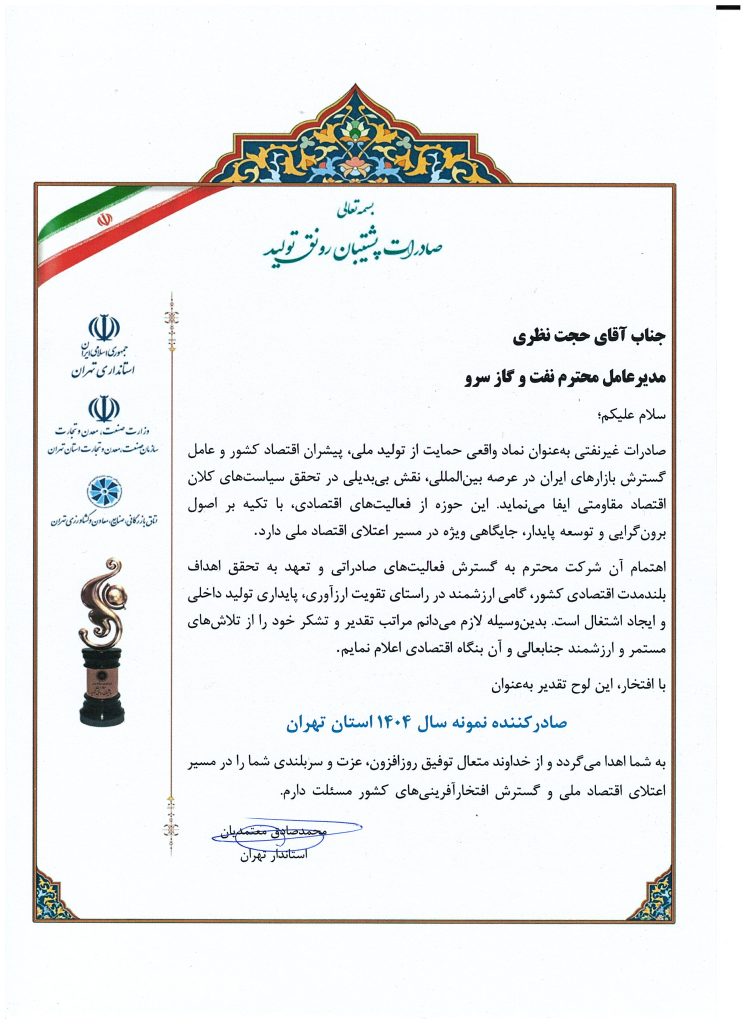 شرکت توسعه صنایع نفت و گاز سرو “صادرکننده نمونه سال ۱۴۰۴ استان تهران”شد
